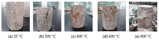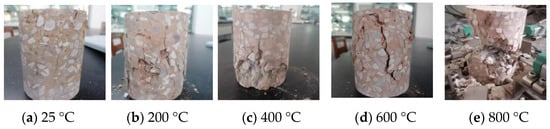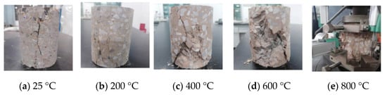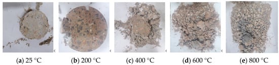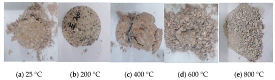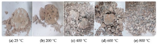 Figure 6 and Figure 7 illustrate the ordinary concrete and basalt fiber-reinforced concrete heated to 200, 400, 600, and 800 °C, respectively.