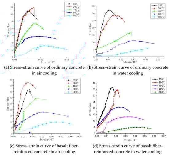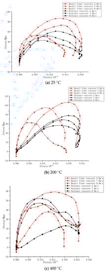 At the same temperatures (25, 200, and 400 °C), the comparison figures of the stress–strain curves of ordinary concrete and basalt fiber-reinforced concrete are shown as follows: