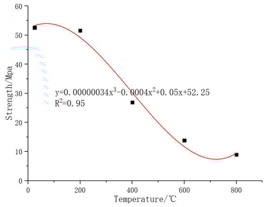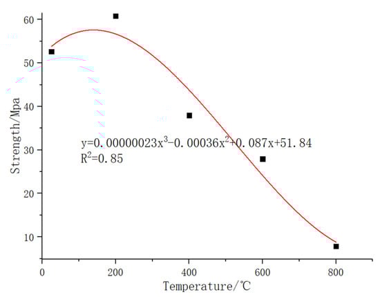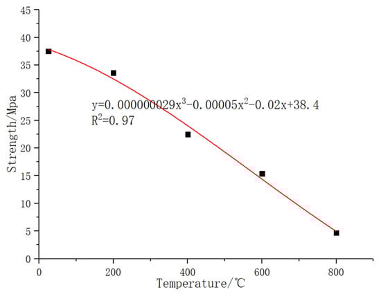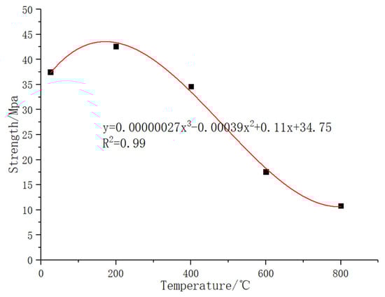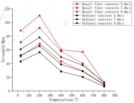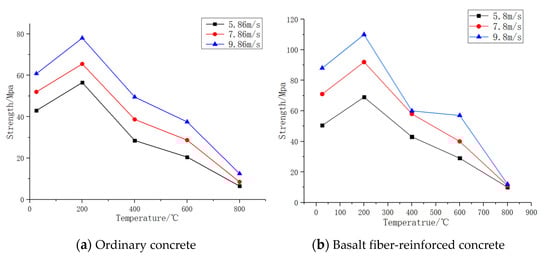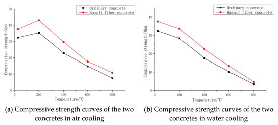 The comparison figures of the temperature–strength curves of ordinary concrete and basalt fiber-reinforced concrete are shown as follows: