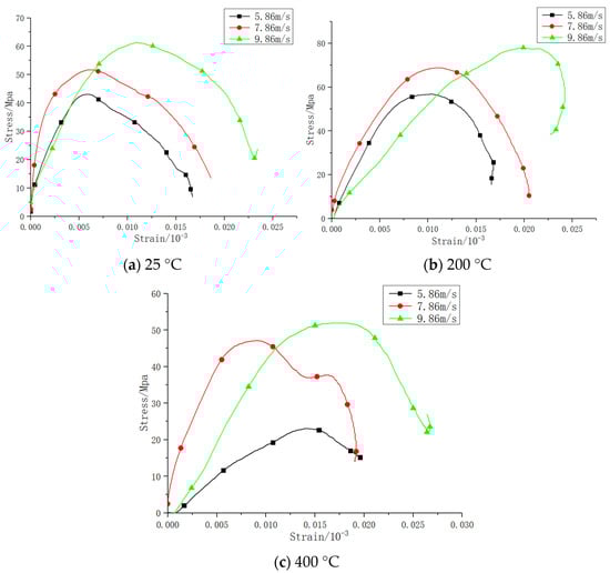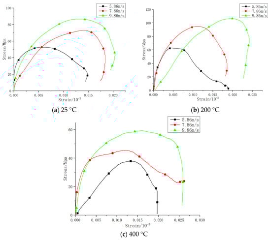 When the loading rate is 5.8 m/s, compared with room temperature (25 °C), the dynamic compressive strength of ordinary concrete improves by 31.3%, 33.7%, 53.4%, and 84.8% at 200, 400, 600, and 800 °C, respectively, while the dynamic compressive strength of basalt fiber-reinforced concrete improves by 43.3%, 11.6%, 50.2%, and 75.7% at 200, 400, 600, and 800 °C, respectively. When the loading rate is 7.8 m/s, compared with room temperature (25 °C), the dynamic compressive strength of ordinary concrete improves by 25.5%, 25.5%, 44.8%, and 83.6% at 200, 400, 600, and 800 °C, respectively, while the dynamic compressive strength of basalt fiber-reinforced concrete improves by 13.6%, 25..8%, 46.6%, and 80.8% at 200, 400, 600, and 800 °C, respectively. When the loading rate is 9.8 m/s, compared with room temperature (25 °C), the dynamic compressive strength of ordinary concrete improves by 28.3%, 18.5%, 38.3%, and 79.4% at 200, 400, 600, and 800 °C, respectively, while the dynamic compressive strength of basalt fiber-reinforced concrete improves by 25.7%, 19.4%, 48%, and 76% at 200, 400, 600, and 800 °C, respectively.