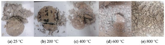 A color change of the specimen was observed after natural cooling, as shown in Figure 6 and Figure 7. It can be seen from Figure 6 and Figure 7 that the specimen was dark blue at room temperature (25 °C). As the temperature increased, the color of the specimen gradually turned red. When the temperature reached 600 °C, the specimen changed from dark blue to pink. When the temperature continued to rise, the test piece gradually began to turn white-brown, because as the temperature increased, the additives in the concrete underwent physical and chemical changes.