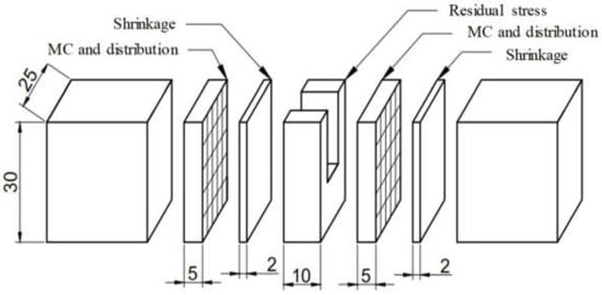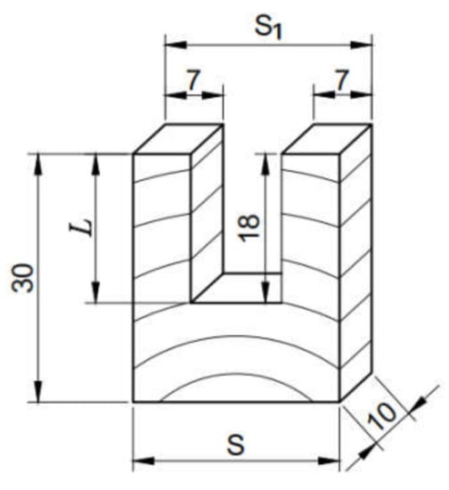 The residual stresses after dewatering of wood were measured using the prong test (GB/T 6491-2012). As shown in Figure 2, one 10-mm thickness slice was sawed from the middle of specimen and was employed for residual stress test. The slice was cut into a sample with a prong shape as shown in Figure 3. The initial thickness S of the specimen and the length L of prong edge were measured using a caliper (0–200 mm/0.01 mm). Thereafter, the slices were dried in an oven at (103 ± 2) °C for 3 h and then placed in ventilation place at room temperature for 24 h. After conditioning, the final dimension of S1 was measured again using a caliper. The stress value Y is calculated using Equation (3):