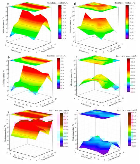 Distributions of wood final MC after 1 h SuCO2 dewatering. (a): 10 MPa/35 °C, (b): 10 MPa/40 °C, (c): 10 MPa/55 °C; (d): 30 MPa/35 °C, (e): 30 MPa/40 °C, and (f): 30 MPa/55 °C.