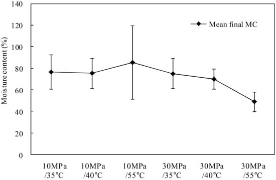 Figure 5 shows the 2D and 3D distributions of MC after 1 h SuCO2 dewatering. The left and right part in Figure 5 indicates the status of MC after dewatering at 10 and 30 MPa, respectively. The mean final MCs and standard deviations of the 25 wood blocks in each dewatering test are shown in Figure 6. The standard deviations indicated as vertical bars present the MC gradients, which decline with decreasing of mean final MCs, showing that the larger MC gradients are present in the stage of higher mean final MC (10 MPa, 55 °C in Figure 6). Similar phenomena are also observed in Figure 5, especially for the conditions of 30 MPa.