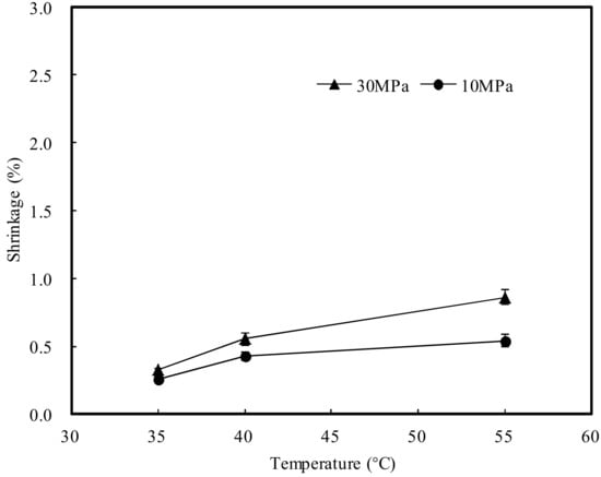 Figure 7 shows the effect of pressure and temperature on shrinkage of wood after 1 h SuCO2 dewatering. Theoretically, wood shrinks as MC decreases to fiber-saturated point (FSP); however, shrinkages of wood were observed after SuCO2 dewatering in each test when their MCs were over FSP (Figure 6). Collapse, an abnormal shrinkage, occurs when MC of wood is higher than FSP, which generally results in abnormal deformation. Severe collapses cause enormous loss of timber and high costs for industries. Therefore, the shrinkages in Figure 7 that occurred in each SuCO2 dewatering indicate collapse of wood. However, the collapses of wood are only between 0.8% and 0.25%, which are much smaller than that of 2.8% in CKD and 3.6% in oven drying []. These results suggest that SuCO2 dewatering may mitigate wood collapse and is in agreement with previous study []. Thus, SuCO2 dewatering is an effective technology for improving timber drying quality. The less severe collapse is mainly attributed to the mechanism of SuCO2 dewatering, which decreases capillary tension due to the fact free water in wood is expelled by CO2 bubbles during decompression []. Additionally, collapse increases significantly with temperature at higher pressure dewatering.