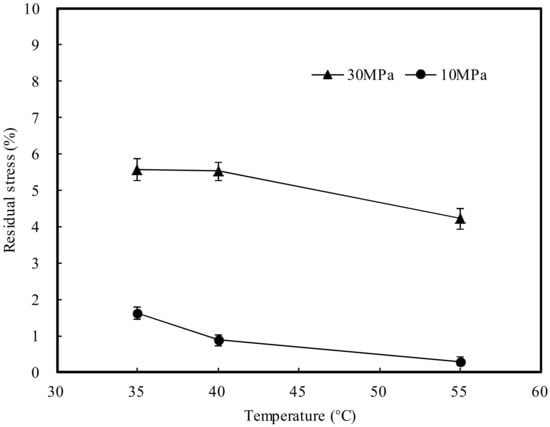Figure 8 is the residual stress of wood after 1 h SuCO2 dewatering test. The drying stresses at higher pressure were much greater than those at lower pressure and decreased with increasing temperature. These findings suggest that pressure mainly affects residual stress of wood in SuCO2 dewatering process. Uneven shrinkage of wood causes stresses when MC of wood is lower than FSP with great gradients [,]. However, greater moisture content gradients also resulted in greater stresses during drying under high-pressure steam conditions when MC of wood is above FSP []. In this study, greater MC gradients in 10 MPa dewatering (Figure 5 and Figure 6) resulted in smaller residual stresses, indicating residual stresses are caused mainly by pressure of supercritical CO2 when MC of wood is above FSP.