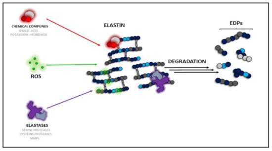 Literature highlights three main causes (types) of elastin degradation: chemical, enzymatic, and ROS-dependent (Figure 1). The first type can be achieved with the use of potassium hydroxide (KOH) or oxalic acid (C2H2O4), which are not present in the organism but are used only to prepare EDPs in vitro given their physicochemical properties. The second type of elastin degradative factors is represented by various proteinases, which act both in vitro and in vivo. To date, three groups of proteolytic enzymes acting as elastases have been described []. Serine proteases released from neutrophils or macrophages act as chymotrypsin-like proteins. They are able to degrade the whole elastin molecule or pre-degraded protein, e.g., proteinase 3, neutrophil elastases, and cathepsin G []. Another group comprises cysteine proteases such as cathepsin K (CatK), L, S, and V, which naturally occur in lysosomes []. The third group of proteases capable of hydrolyzing elastin are metalloproteinases (MMPs), which require metal ions for their hydrolyzing activity, e.g., MMP-2, -7, -9, and -12 [].