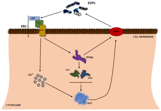 All these mechanisms, i.e., the increase in ROS production, Ca2+ influx, PPARγ signaling pathway activation, and the increase in the expression and/or activity of MMPs lead to accelerated elastin degradation in ECM and production of increased numbers of EDPs (Figure 2).