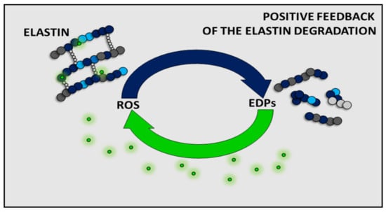 To date, the effect of EDPs has been shown to be dependent on the type of cells or model organisms. However, it is generally accepted that EDPs can indirectly (by affecting the expression and/or activity of antioxidant enzymes such as CAT or SOD) and/or directly affect the level of ROS. Moreover, increased EDP levels have also been detected in various pathological conditions associated with a high level of ROS (e.g., cancers, arteriosclerosis, obesity). Given the literature data presented here, it can be assumed that there is some positive feedback between ROS and EDPs, and the presence of one component increases the amount of the other one (Figure 3). This phenomenon fits into the free radical theory of aging. Moreover, due to the inseparability of EDPs and ROS, the cellular aging can only be slowed down by reduction of the amount of ROS in the organism. A healthy lifestyle and an antioxidant-rich diet or avoidance of high sun exposure may be helpful to slow down aging. Unfortunately, we have no influence on the spontaneous elastin degradation process during aging. Therefore, future medicine should focus on the antiaging therapies on inhibition of elastin degradation, removal of EDPs from the organism, and acceleration of the reconstruction of elastin in tissues.