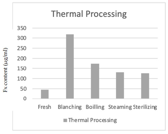 In another study, Indonesian brown seaweeds were analyzed to see if heat treatment would affect four different components, these being fucoxanthin, antioxidant activity, total phenolic content and color stability; however, in this review, we will highlight the first and the second compounds [12]. These seaweeds were subjected to four different heat processes: boiling, blanching, steaming and sterilizing (Figure 2). Fucoxanthin is abundant in brown seaweeds and it has several health benefits. By putting the seaweeds through the four heat treatments, we obtained different results. In Figure 2, we can see these differences accordingly [12]. When raw/fresh, the amount of fucoxanthin in the seaweed was very low; however, when heated, these values increase. As we can see, the heat process that is most beneficial is blanching, followed by boiling, then steaming and sterilizing [12].