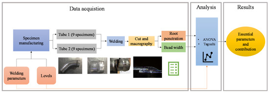 For this research, a specific flow-work (Figure 1) was ad hoc established to analyze and optimize the essential parameters that affect the quality of the weld such as the weld root penetration and the welding bead width. This process is repeated twice (experiments 1 and 2).