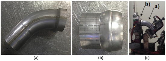 (a) Tube 63.1 mm in diameter, (b) tube 63.8 mm in diameter, and (c) welding position of the two tubes.