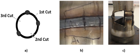 (a) Schematic representation of the cuts in a circular weld bead, (b) marking the area to be cut, and (c) cut tube.