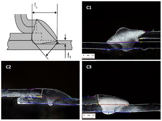 According to the data obtained by the StructureExpert Weld integrated software, the values for welding penetration and weld bead width were extracted. In Figure 5, it is possible to show an illustration of macrographic images obtained from different samples. On top left is represented schematically a weld bead with the main geometric parameters, on C1, C2 and C3 are macrographic images from different samples. The tests were performed twice in each configuration. The summary of the resulting measurements for the experiment, represented in Figure 5, are shown in Table 3. Evaluating the measurements implemented for all experimental tests, an average value of 0.82 mm and 4.50 mm was obtained for the penetration and width of the weld bead, respectively.