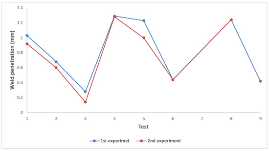 Graphic representation of the average values obtained for welding penetration in experiments 1 and 2.