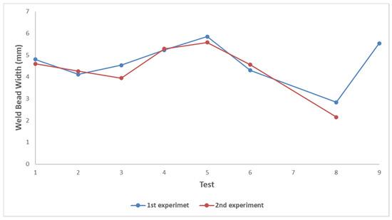 Graphic representation of the average values obtained for the width of the weld bead in experiments 1 and 2.