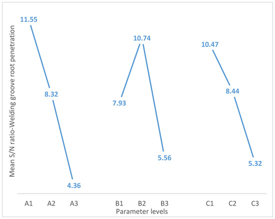 S/N ratio vs. parameter levels for weld bead root penetration.