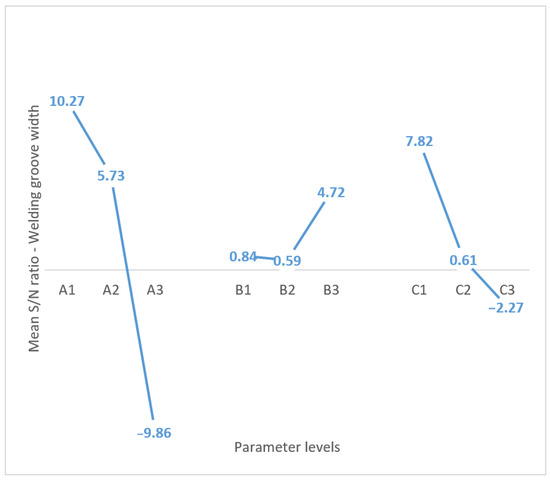 The difference found for the three different levels is notorious. Larger values of S/N ratio identify control factor settings that minimize the effects of noise factors. The same analysis for the width of the weld bead was carried out and the values presented in Table 8 were obtained. The total average of the S/N ratio is 2.05 dB.