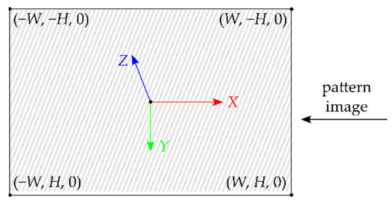 The origin of the world coordinate system is assumed to be located at the center of the pattern object. The X and Y axes lie on the pattern object plane, while the Z axis is perpendicular to it, pointing to the camera. The X and Y coordinates of the four corners of the pattern object in the world coordinate system are computed using the normalized width (W) and height (H) of the pattern image, according to Equation (1):