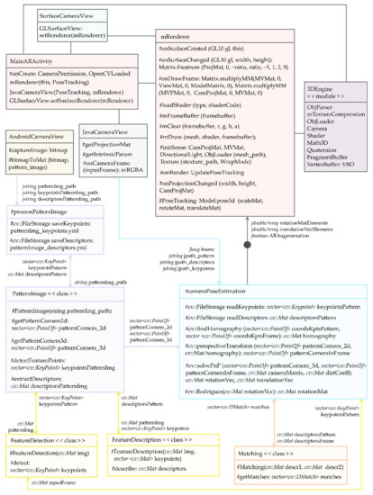The 3D rendering thread is initialized when the instance of the 3D graphics engine is associated with the application layer. The mRenderer activity constructs a new renderer for the SurfaceCameraView. The onSurfaceCreated class enables depth testing and culling to remove non-visible back faces while onSurfaceChanged adjusts the viewport based on geometry changes and calculates the frustrum. Then, the shader type and the framebuffer of 3D engine along with the methods mClear and mDraw are defined. After performing these internal initializations, the graphics engine invokes the method initScene, with the essential for the rendering of the scene objects. All the necessary functionalities for loading the files and configuring the camera are provided by the ObjParser, ObjLoader, mTextureCompression, Camera and Math3D classes of the 3D engine. Then, the ModelView arrays are instantiated, in addition to the basic lighting for viewing the scene. In the JavaCameraView class, three main operations are executed: (i) getProjectionMat estimates the camera every time the camera is initialized or reconfigured and the mRenderer class is notified through the onProjectionChanged method to update the CamProjMat variable with the new matrix; (ii) getIntrinsicParam sets the intrinsic camera matrix and translates it into a projection matrix; and (iii) onCameraFrame gets and stores every frame in order to be sent to CameraPoseEstimation. The AndroidCameraView class captures the frame to be used as pattern image and converts it from bitmap to Mat in order to be passed to processPatternImage. Finally, the MainARActivity checks for runtime camera permission and library dependencies, holds the views and sets their order and enables the PoseTracking function execution.