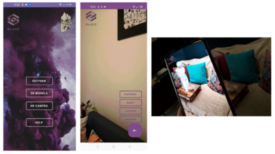 On ModAR initialization, the users can choose from the main menu the desired pattern image, if it is already captured, and their 3D file of OBJ format from local storage. The option of capturing planar objects of their surroundings directly from the prototype’s camera module and load one of the default 3D models, is also provided. In this case, the 3D model can be directly selected from a list menu that overlays the camera view. The graphics user interface of ModAR as well as a scene augmented with a pre-loaded 3D model are presented in Figure 3. ModAR comes with four 3D models and six default pattern images stored as bitmaps in the internal memory (Figure 4). Thus, each AR scene consists of one 3D model that is drawn once the corresponding pattern image is met by the camera. The 3D model is displayed in the center of the pattern object, either with a default scale (its biggest dimension being equal to the biggest dimension of the pattern image) or with a user-specified scale. If the users want to select another model to be overlaid to the same or another pattern, they have to return to the previous screen and pick again the files. The previous surface is destroyed but no cache or buffers destruction occurs. If any of the previous 3D models is selected, an instanced version is ready for visualization. Figure 5 shows screenshots from the ModAR prototype depicting the pattern recognition and AR augmentation processes.