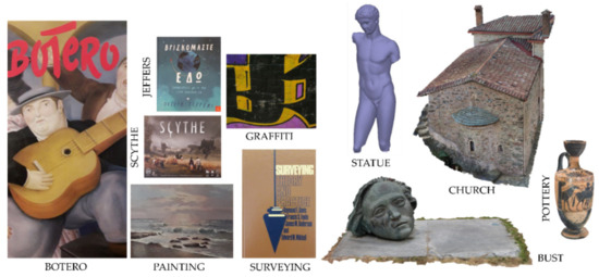 The overall objective is to understand the impact of the hardware specifications on the performance attained by both the computational and rendering operations of ModAR. Moreover, the examination of the effectiveness of the developed techniques and strategies as well as the interpretation of the testing results lead to guidelines and suggestions. The testbed comprises one old low-end and one affordable mid-range Android mobile device. The minimum target version of ModAR is Android API level 19, a.k.a. Android 4.4 KitKat, released on 31 October 2013 (Table 2) and the OpenGL ES version is 2.0. The six different pattern images and four 3D models that come with the ModAR prototype (Figure 4) were used in the experiments. The pattern image hereinafter referred to as “BOTERO” is part of a book cover; the pattern image “SCYTHE” is the planar front surface of the box of a board game; the pattern images “SURVEYING” and “JEFFERS” are book covers; “PAINTING” is a wall painting inside a frame; and “GRAFFITI” is an outdoor wall mural. The size of the pattern images used in the experiments is within the range 0.07–0.25 MP (see Table 3 for the exact dimensions), while the size of the camera frames in the test devices is 0.92 MP for the low-end device (720 × 1280 pixels) and 2.07 MP for the mid-range device (1080 × 1920 pixels), both corresponding to a frame rate of 30 FPS. The textured Wavefront OBJ models are of multiple scales and heterogeneous sources, like image-based photogrammetry and terrestrial laser scanning. Each model differs in size and complexity, thus “POTTERY” and “BUST” are denoted as small models, “STATUE” as of regular size and “CHURCH” as large model. “STATUE” is the only one with vertex color and no texture.