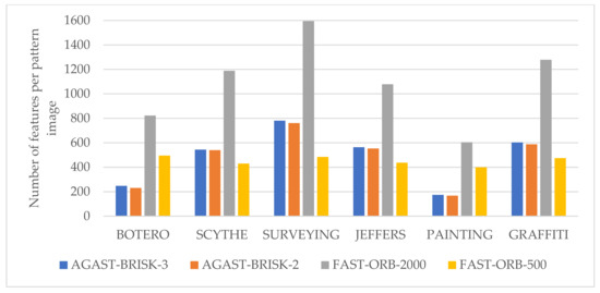 The number of feature points extracted in each pattern image for every experiment performed by the ModAR prototype is outlined in Table 4. The experiment FAST-ORB-2000 yields the greatest number of feature points in each pattern image, which significantly differs based on the pattern image. The small dimensions of each pattern image along with the lack of corners in some of them resulted in much less features than the maximum threshold of 2000 in this experiment. The experiment FAST-ORB-500 yields approximately similar numbers of feature points in each pattern image (lying within the range of 400–500 features), because of the threshold of 500 features per image. The experiments AGAST-BRISK-3 and AGAST-BRISK-2 yield approximately the same number of features in the tests performed with the same pattern images, as their only difference is the number of octaves used in scale-space. The smallest number of feature points per pattern image is observed either by the experiment AGAST-BRISK-2 or by the experiment FAST-ORB-500. While the number of feature points extracted by the latter lies near the upper threshold of features set by this experiment, the number of features extracted by the AGAST detector greatly depends on the content of the pattern images (i.e., the detected corners) and differs based on it. Figure 6 illustrates clustered bar charts with the number of feature points for each pattern image, extracted by the tested detectors with different parameterization.