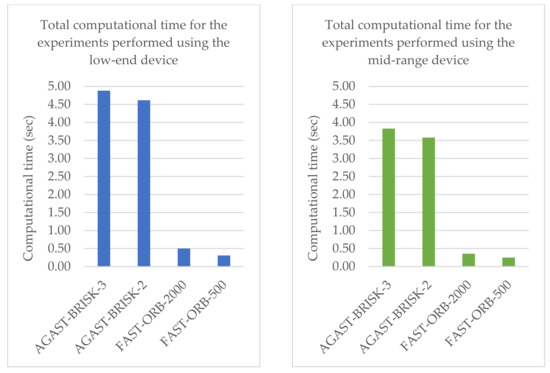 The AGAST-BRISK-3 experiment was the most time consuming one. The AGAST-BRISK-2 experiment was a little faster. However, both experiments were proved to be unsuitable for the ModAR prototype. The FAST-ORB-500 experiment was accomplished in the shortest time, as it required in average 0.309 s for the low-end device and 0.250 s for the mid-range device. Additionally, the FAST-ORB-2000 experiment proved to be suitable for AR augmentation, as it was accomplished in average in 0.434 s for the low-end device and 0.356 s for the mid-range device. Thus, only the combination of the oriented FAST detector and ORB descriptor were further evaluated in ModAR. They achieve about 90% reduction in the computational time of image matching compared to the corresponding time required by the AGAST detector and BRISK descriptor. The rest tasks that complete the computer vision workflow (mainly the reading of the extracted feature points of the pattern image and their descriptors in each frame, along with the basic steps of pattern recognition and camera pose estimation) were completed in less than 0.250 s for all experiments. The total computational time required by the four basic steps of image matching for each experiment performed via ModAR is illustrated in the form of clustered bar charts in Figure 7.
