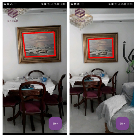 An example of the minimum pattern scale (maximum distance from the pattern object) for which successful pattern recognition is achieved using the two different detectors—descriptors (FAST-ORB-2000 and AGAST-BRISK-3) is illustrated in Figure 8, where it is observed that BRISK permits pattern recognition in bigger changes of scale than ORB. However, FAST-ORB-2000 yields successful results is an acceptable range of scale, as shown in Figure 9, where pattern recognition performed by ModAR in camera frames under different scales and rotations as well as different illumination conditions and occlusion is shown.