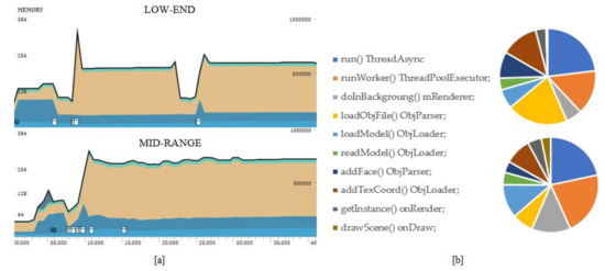 The classes ObjLoader and ObjParser of the developed 3D engine as well as the mRenderer of the rendering thread generate the largest number of temporary objects and impose time restrictions on prototype’s memory allocation per frame. When attempting to render and load a huge volume of vertices on low-memory devices, performance issues with excessive demands on CPU arise, like the memory leak that happened during the 20–25 s on the low-end device (Figure 10b). Furthermore, UV texture mapping has a significant memory instances count. Therefore, techniques compatible with OpenGL ES 2.0 such as vertex-data re-ordering, organization on VBOs and texture compression are essential for the overall performance amelioration.