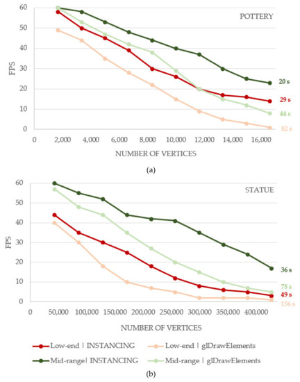 The proposed optimizations applied to the developed 3D graphics engine are compared with standard rendering methods to determine their impact and efficacy. The techniques of (i) instancing and (ii) vertex-data organization are tested individually. In every comparative test, the OpenGL ES commands of each technique are organized in groups using markers and annotated with descriptive labels. For geometry instancing evaluation, two separate sessions with the 3D models “POTTERY” and “CHURCH” are created for frame rate of 60 FPS. In the first one, each mesh is drawn ten times with standard index rendering (glDrawElements) and the second one implements the developed technique that draws ten instances of each mesh in one call. A unique transformation matrix is applied to each of the ten meshes in both cases, in order to replicate a real AR usage scenario. Total rendering time as well as the FPS corresponding to the number of vertices being drawn at each frame are presented in Table 10 and Figure 11, respectively. The best results are obtained with instancing, as expected. A total of 16,610 vertices for the “POTTERY” and 427,120 vertices for the STATUE are rendered in a single draw call in less than 20 s and 36 s at the mid-range device and 29 s and 49 s at the low-end one. Regarding drawing performance, FPS drop is significant after the seventh instance for both devices when 11,627 and 298,984 vertices are being drawn for “POTTERY” and “STATUE”, respectively. Both sessions render the same number of vertices and it can be concluded that the number of draw calls is the actual bottleneck. However, the “STATUE” has 26 × more vertices and is 10× larger in size than “POTTERY” but rendering during instancing is only 1.14x faster for the low-end and 2.2× slower for the mid-range device. The increased rendering tine can probably be attributed to the texture file of “POTTERY” which needs to be accessed and fetched from texture cache memory while GPU is running at the main thread.
