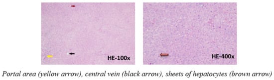 The microscopic images of the liver in the control group shows an image of normal liver tissue with a structure of cell bands, and rafts surrounding the central vein of the lobule. Between the bands, the liver rafts are the sinusoid. Some liver cells are slightly degenerated. The portal area contains the bile duct, portal vein, and hepatic artery (Figure 2).