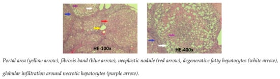 The microscopic images of the liver in the CCl4 group show that the standard structure of the liver was destroyed. The hepatic parenchyma was separated by the fibrosis septa from the center of the lobule to the portal areas and from the portal areas to the portal areas. Most lobules and the portal areas were invaded by bands of fibrosis; with the regeneration of hepatocytes, they formed pseudo lobules. The central vein of the central lobe was not clearly visible. Many fat degeneration cells, accompanied by infiltrated white blood cells surround the necrotic liver cells. These livers were stage F4 fibrosis [] (Figure 3).