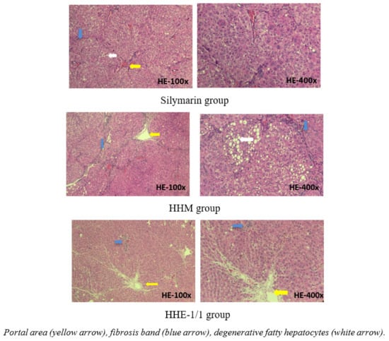 The microscopic images of livers in the silymarin group and HHM group and HHE-1/1 group: the structure was maintained, hepatic parenchyma did not appear in pseudo lobules. However, the appearance of short fibrous bands, extending the portal areas, dissecting the liver parenchyma can be observed. The liver parenchyma of the HHM group shows clusters of liver cells with fat and water degeneration, which were observed scattered in silymarin and HHE-1/1 group. These livers were stage F2 fibrosis [] (Figure 4).