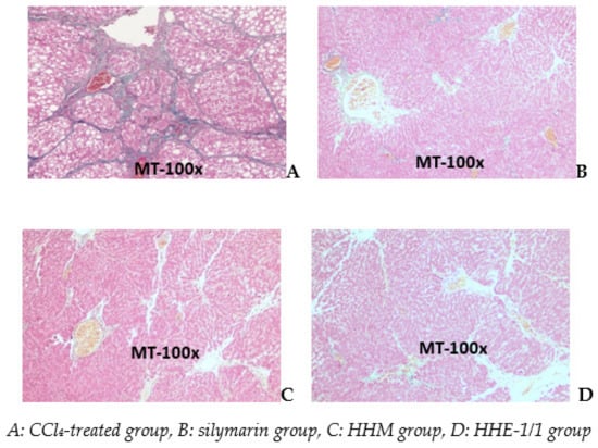 In addition, the Masson trichrome staining image showed that the collagen areas in the livers of the CCl4 group (19.9%) were significantly higher than the silymarin group (1.19%), HHM (3.44%), and HHE-1/1 (5.12%). This result proved that the collagen deposition in the liver of the CCl4 group was higher than in other groups; this is an important indicator to evaluate the level of liver fibrosis. Silymarin, HHM, HHE-1/1 were used to help alleviate the deposition of collagen in the liver parenchyma and prevent fibrosis of the liver. The study on the hepatoprotective effects of pomegranate peels and seeds by Xiang-Lan Wei also showed that the collagen deposition in the toxic group with CCl4 was higher than in the group treated with pomegranate peels and seeds extracts [].