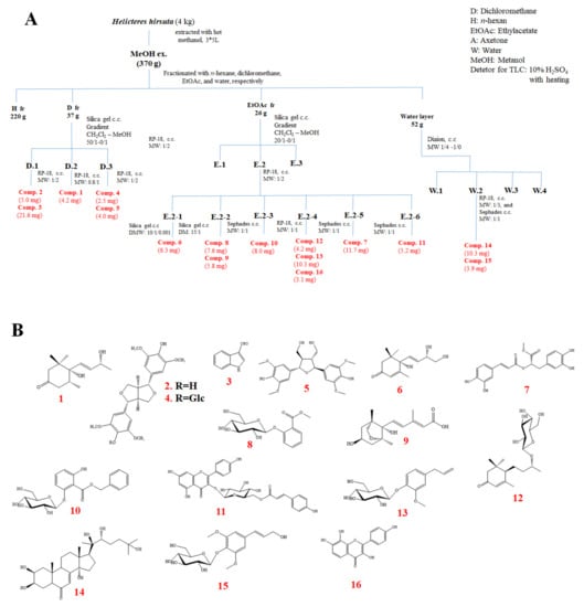 (A) Isolation scheme of the H. hirsuta, and (B) chemical structures of compounds (1–16) isolated from H. hirsuta.