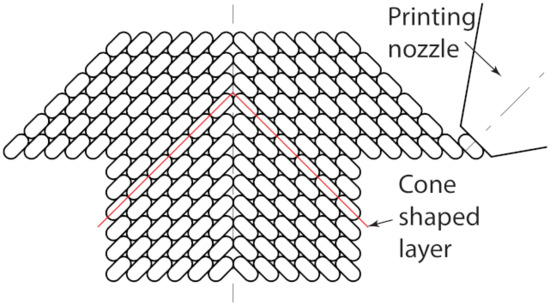 Müller [21] presents on his blog another important result with a conic slicing approach, where conic slicing approach is used to print 90° overhangs with a conventional 3-axis printer. He adapted the conic slicing with a much lower angle (15–25°), such that the non-tilted nozzle does not interfere with the already printed part.