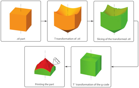 Figure 5 illustrates the workflow for the presented slicing strategy. First the STL file is convertedwith the shown transformation T, which is described in more detail in Section 2.2. Then this STL file is sliced with a conventional slicer with optimized settings as described in Section 2.3. After that, the G-code is back-transformed using , which is presented in Section 2.4.