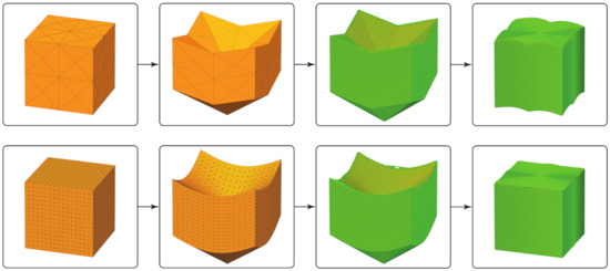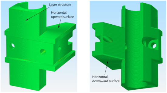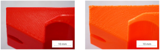 The triangles are usually as large as possible to keep the file size small. However, with this slicing approach, large triangles lead to artifacts, which decrease the surface quality of the printed object dramatically. Figure 6 shows this effect, where the triangles of the upper STL file have a length of 15 mm and the ones of the lower STL have a length of 2 mm. So, the maximal size of the triangles is decreased, until the part reaches the required surface quality. Experience shows that the maximal length of a side of a triangle should be between 1–2 mm.