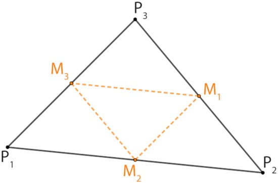 There are different ways to refine the triangles. One is to use the export settings of the CAD, where possibly the maximal triangle size can be defined. Another way is to integrate the refinement into the Python script that transforms the STL file. Therefore, the sides of each triangle are bisected, and the three newly generated midpoints are connected (Figure 7). One triangle produces four smaller (and congruent) triangles with this procedure.