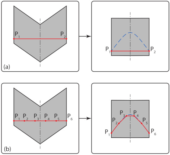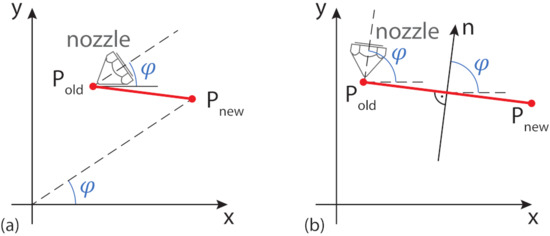 Since does not transform lines into linear lines, long line segments may have to be split. The upper left drawing of Figure 9 shows a linear move, which can be described with one G-code command. The nozzle would be in position (“old” point) and the endpoint of the line would be in (“new” point). When this line consisting of the start-point and the end-point, now is back-transformed with , then the printer would follow a line, again from to (upper right drawing). However, with an infinitesimal transformation , the nozzle would have to move on a cone section, here a hyperbolic curve, shown in blue. Lines have to be split into small segments of equal length to achieve proper accuracy. Thereby, the segments must be be short enough to achieve the required accuracy. However, too short segments increase the size of the G-code file.