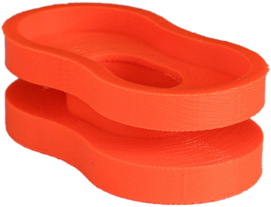 Horizontal layers of the printed reference part printed on a Prusa Mk3s (red) and the RotBot (orange).