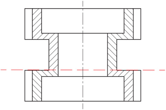 A part with a combination of an inside and an outside overhang is shown in Figure 23. Therefore, the part was split up in two parts, a lower part with the inward overhang and an upper part with the outside overhang. These parts have been sliced separately with an inward cone for the lower part and an outward cone for the upper part. After transforming the G-code back, the two parts have been combined by simply adding the two G-codes. Figure 24 illustrates the section through the part with the cutting line (red), the inward cone in the lower part and the outward cone in the upper part.