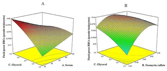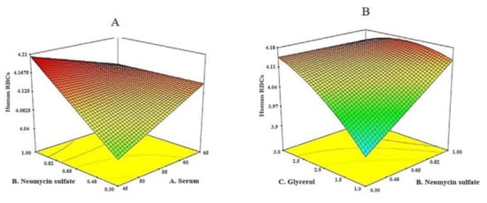 The response surface for the number of RBCs according to the ratio of neomycin sulfate and serum (A) and neomycin sulfate and glycerol (B).