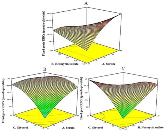 The response surface of the number of pseudo-platelets according to the ratio of neomycin sulfate and serum (A), glycerol and serum (B), and glycerol and neomycin sulfate (C).