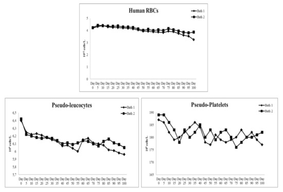 The reference samples for hematology diagnostics need to have long shelf life to provide enough time for laboratories to perform the tests, including distribution time. The concentrations of the cells were similar to those in normal blood samples, which were 3.5–4.5 × 1012 RBCs/L, 4.5–8.5 × 109 WBCs/L, and 150–250 × 109 PLTs/L [8].