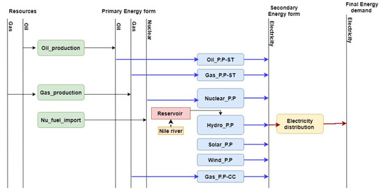 Figure 1 shows the energy chain in Egypt, which consists of four levels. The first level comprises the resources where Egypt extracts NG and crude oil. In addition to its extracted resources, Egypt will import nuclear fuel to satisfy its energy demand for a nuclear power plant. The second energy level consists of the primary form of energy, which involves the preparation and treatment of the extracted energy form for conversion to another form before using it in various technologies. The third level refers to the secondary form of energy, which represents the pre-final form of energy before sending it to the recipients for consumption. The fourth and final level is the final demand energy. The energy chain in Figure 1 shows that gas, oil and, electricity represent the final electricity-form demand in Egypt.