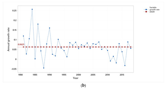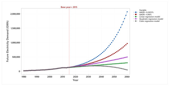 Energy-demand projections drive the energy system. It is the most important parameter in the optimization process. In this study, data on the electricity demand from 1980 to 2015 (base year) are collected and statically analyzed by two models to select the most conservative model as an input. The first model is the average annual growth rate (AAGR) of 6.2453% for the electricity demand. The value of AAGR was considered depending on the normal distribution of the annual growth rate from 1980 to 2015 [16]. Figure 2a summarizes the statistical analysis of the annual growth rate for electricity consumption. The average value is 0.062453, and median value is 0.060406. Figure 2b shows the fluctuation of the annual growth rate from 1980 to 2015, and the average value of annual growth rate. From a literary review, we obtained the value of the average annual growth rate of 4.46%. This value was calculated by applying the computable general equilibrium model. This model was developed by the international food policy research institute to use in the analysis of agriculture plans. However, the model can be used to determine electricity demand [17]. The second model used was the polynomial regression analysis. We used the previous data collected to generate three regression models. The first model was a linear regression model with R2 = 96.4%, the second model was a quadratic regression model with R2 = 98.7% and the final model was a cubic regression model with R2 = 99.0%.