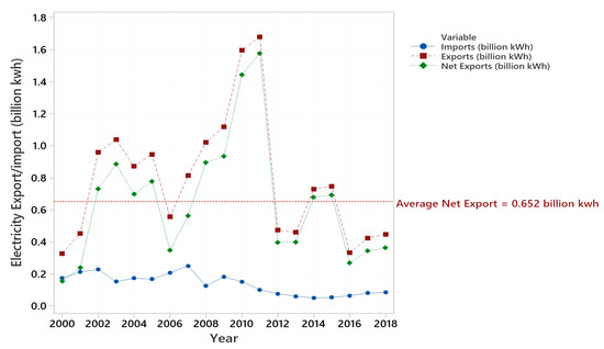 The export and import electricity are neglected in this study according to the historical data collected. Figure 4 illustrates the net exports of electricity. The net export is electricity export minus electricity import. As we can see, the average net electricity export is 0.652 billion kWh which represents 0.5% from electricity generated in Egypt and 0.6% from the country’s electricity consumption.