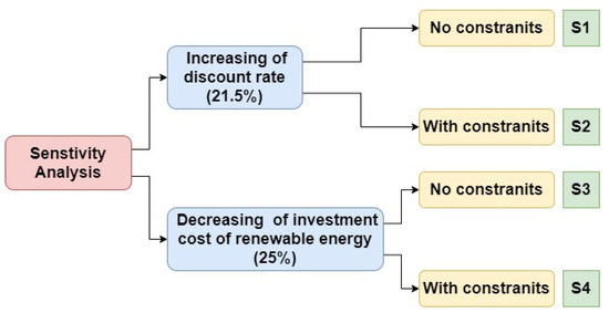 In this study, some parameters were used as constant values because the future values are unavailable. A sensitivity analysis was performed on two parameters to explain the uncertainty in the output of a mathematical model; the first one is increasing the discount rate from 8.75% to 21.5%. This value is the highest value of discount rate from 1991 to 2020 [15]. Figure 5 shows the cases used in the sensitivity analysis. The simulation was performed on two planning horizons without any constraint on the CO2 emission or electricity generated by natural gas and with constraint. The second parameter is decreasing the investment cost of renewable energy by 25% of the value used in the simulation. The second parameter was applied without any constraint and with constraint.